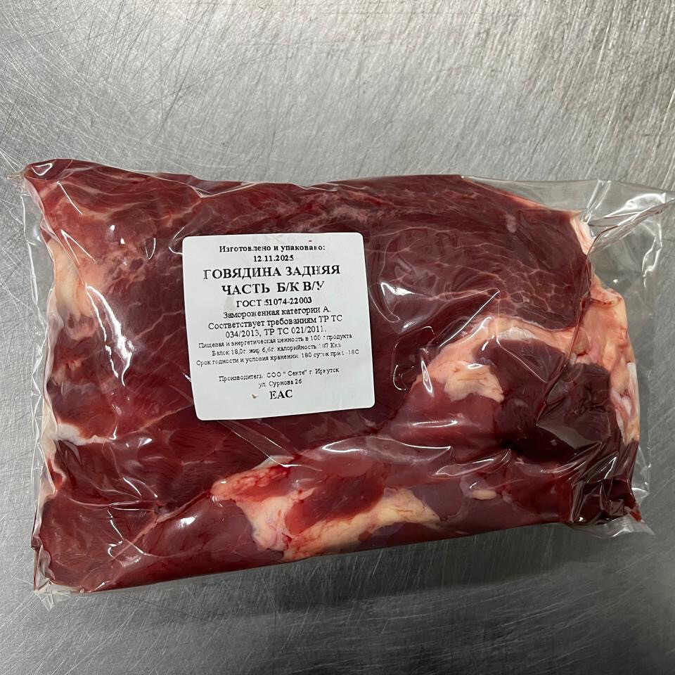 Задняя часть говядины - мясистая, мягкая и сочная бедренная часть туши с жировыми и жилистыми включениями (задний отруб). Без кости. Продаётся в свежемороженном виде, распиленными, не калиброванными кусочками. Упаковка в стретч плёнку.