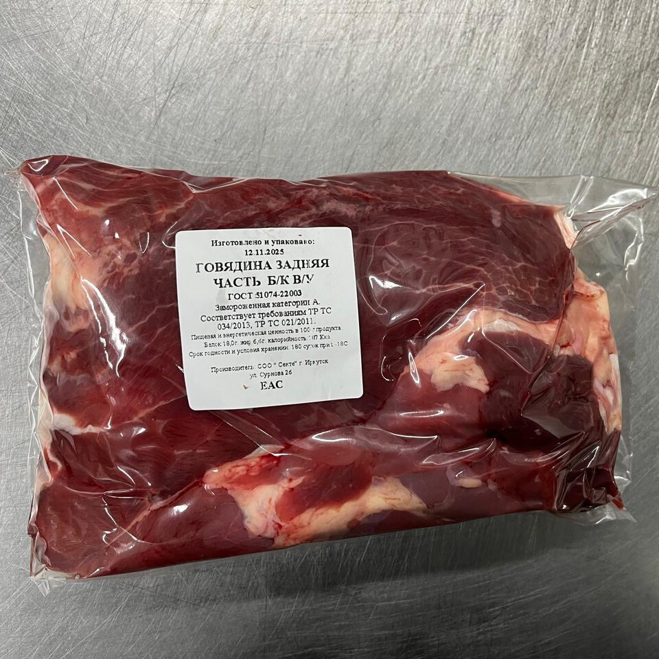 Задняя часть говядины это мясистая, мягкая и сочная бедренная часть туши (задний отруб). В меру жирная и низкокалорийная. Без кости. Продаётся в охлаждённом виде, не калиброванными кусочками. Вакуумная упаковка.
