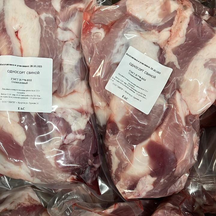 Свиной односорт - это мелкие кусочки мяса с небольшим количеством жилок и 25-30% жира, после жилочки свиной туши. Без кости , продается в свежемороженом виде , не калибрированными кусочками. Упаковка в стретч плёнку.