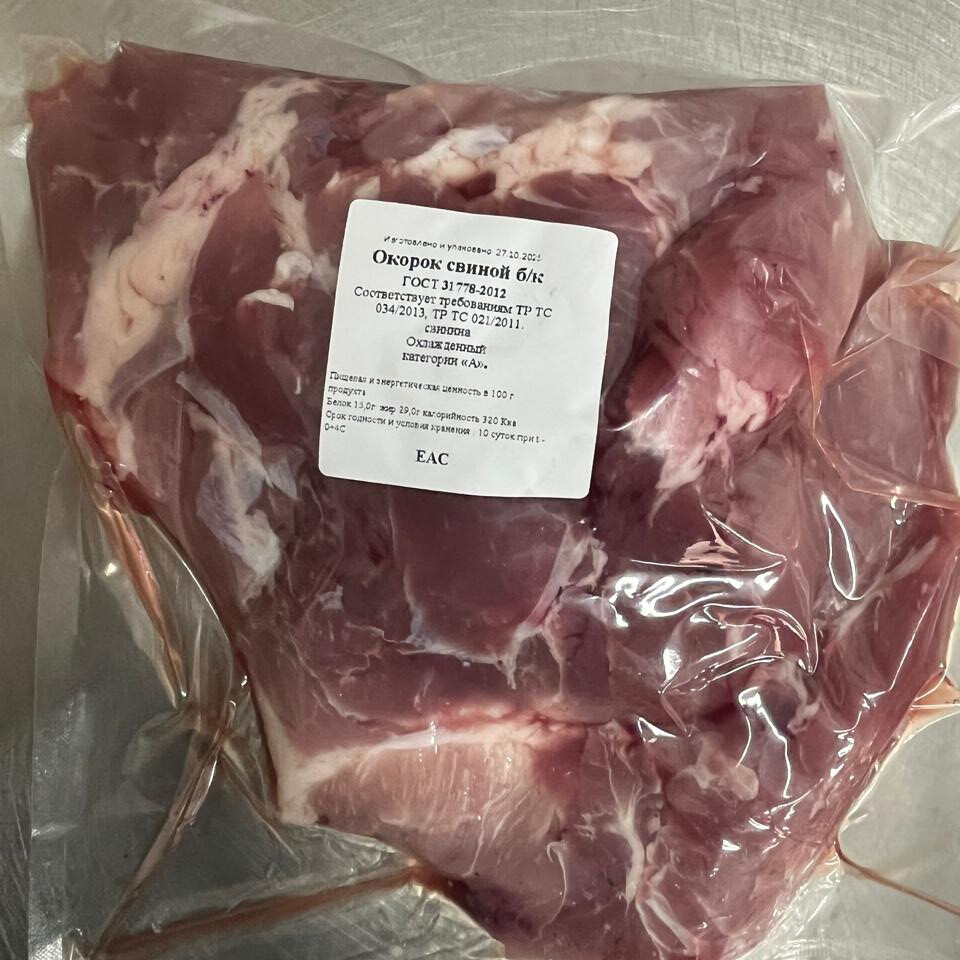 Свиной окорок - часть свиной туши, прилегающей к поясничной и тазобедренной части. Отличается сочной и плотной мякотью, окруженной тонким слоем пленки и жира. Без кости. Продаётся в охлажденном виде, целыми, не распиленными кусками. Упаковка в стретч плёнку.