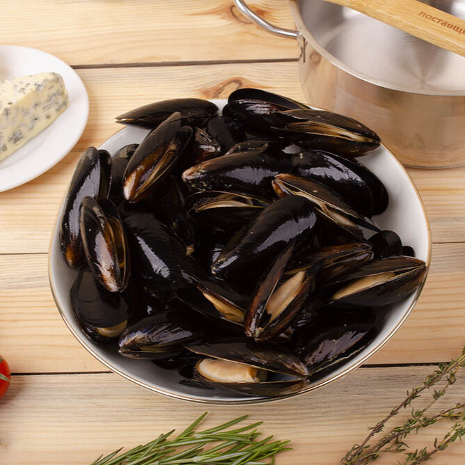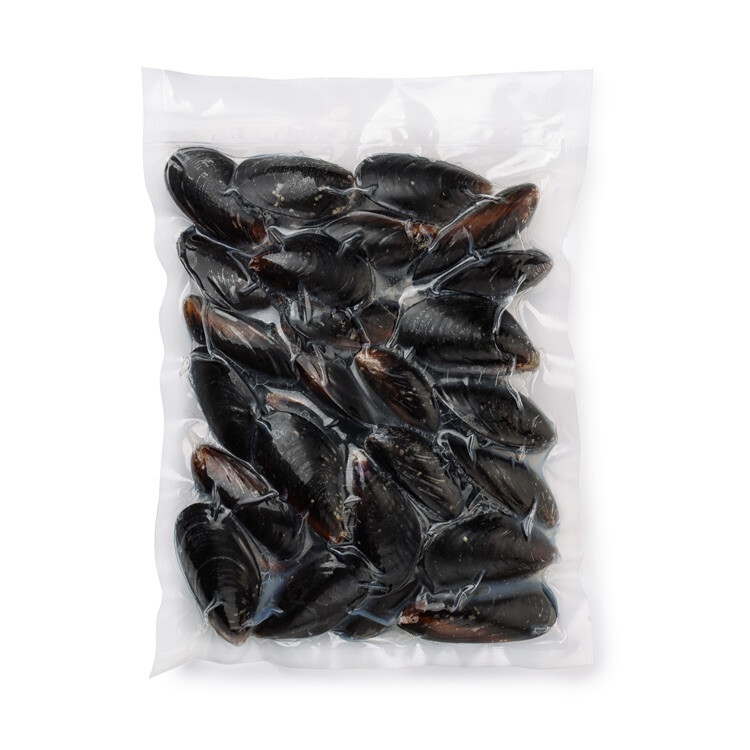 Мидии в раковине (601р/опт) 40-60шт/кг в собс.соку 1 кг/уп