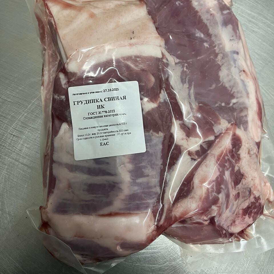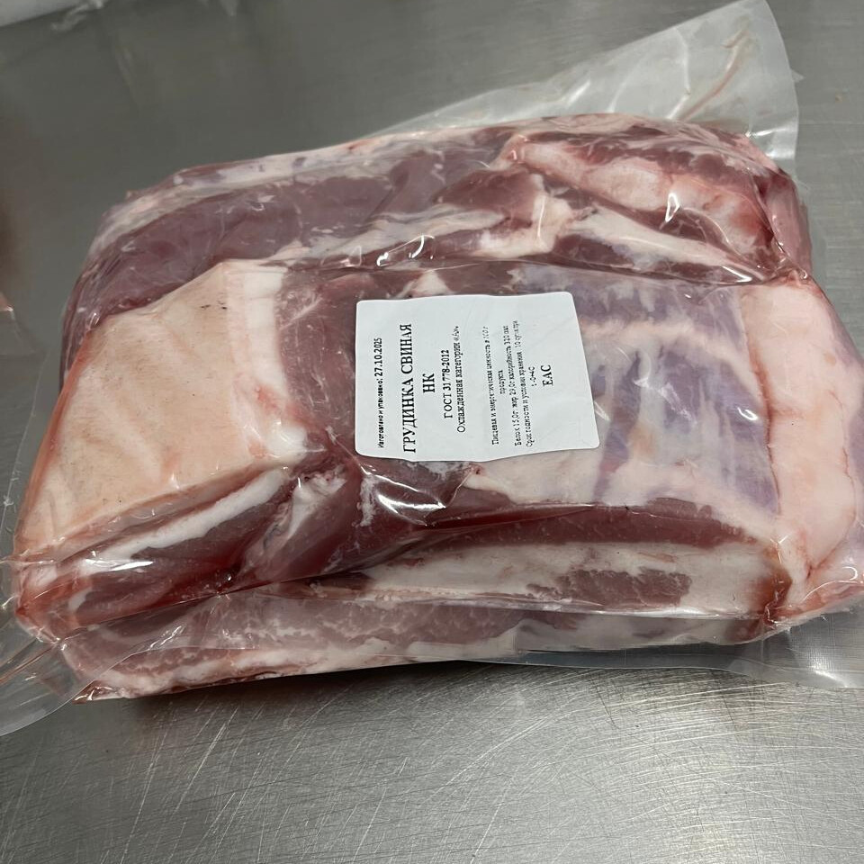 Грудинка на кости продаётся в свежемороженном виде, распиленными, не калиброванными кусочками, толщина от 1 до 10 см, степень жирности может варьироваться. Упаковка в стретч плёнку.