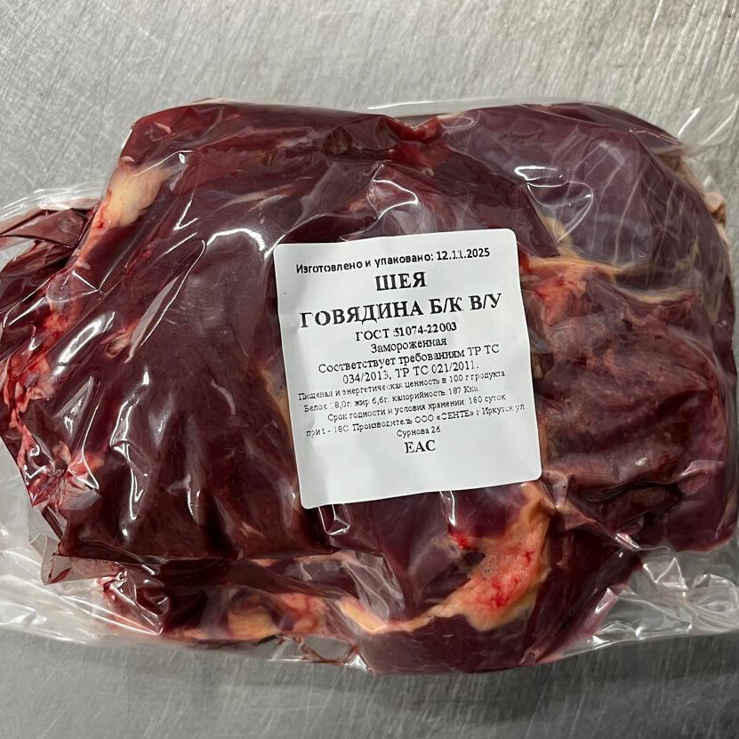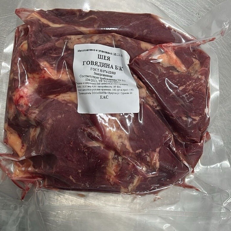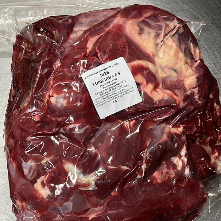 Шея говяжья без кости – это часть туши животного, которая имеет жировые прослойки и сухожилия. Без кости. Продаётся в свежемороженном виде, распиленными, не калиброванными кусочками. Упаковка в стретч плёнку.